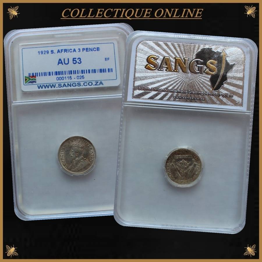 1929 : UNION S. A. : THREE PENCE : COIN IN AU 53 :  LOW Minted 1.947.718  : GRADED by S.A.N.G.S. 1929 : UNION S. A. : THREE PENCE : COIN IN AU 53 :  LOW Minted 1.947.718  : GRADED by S.A.N.G.S. 1929 : UNION S. A. : THREE PENCE : COIN IN AU 53 :  LOW Minted 1.947.718  : GRADED by S.A.N.G.S.