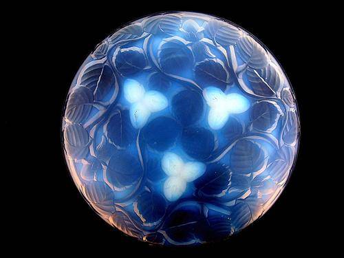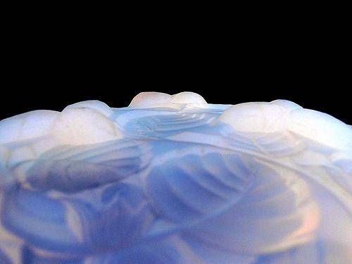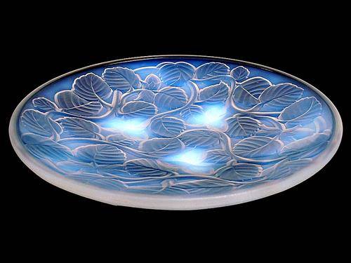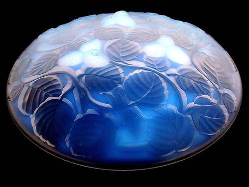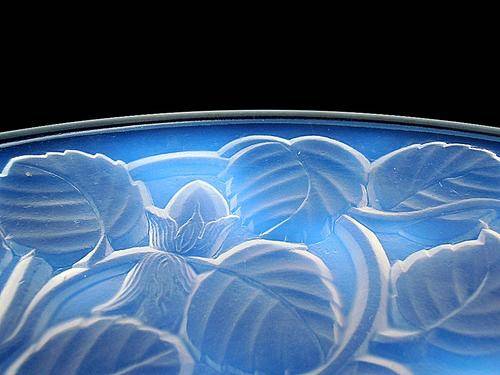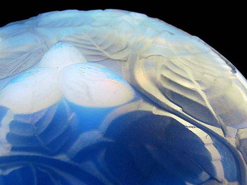 1930's Art Deco opalescent glass bowl made in France. The bowl has minimal signs of use, no chips, cracks or other damage that I can see. Please note that my photos make the glass appear in a far darker, stronger blue than the actual colour of the item which is, as the name suggests, more opal coloured. Diameter is 24 cm.