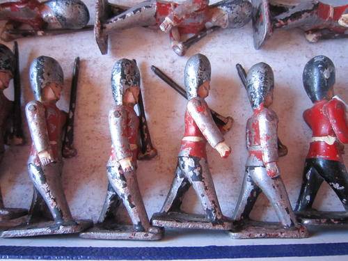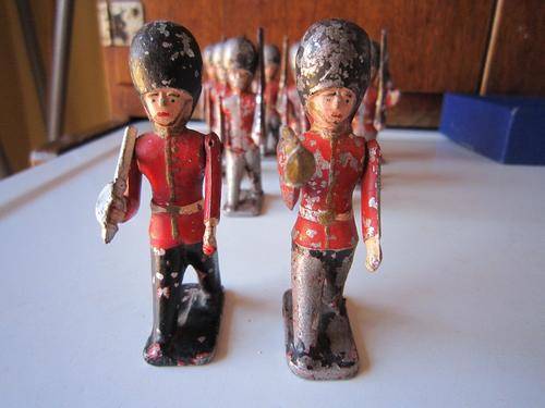 Very old pewter or maybe zinc ( not heavy enough to be lead ) British soldiers, there are 9 soldiers with rifles and then 1 with a bugle and 1 with sword that has lost its tip, their arms also move. They have lost a lot of paint and must have been well played with, but they really are unusual and very different from Brittians lead toys. I was told by the person I purchased them from and from an antique dealer that they thoughe that they were 1930's and maybe from Port Elizabeth. Each one stands approx 7.5cms high.