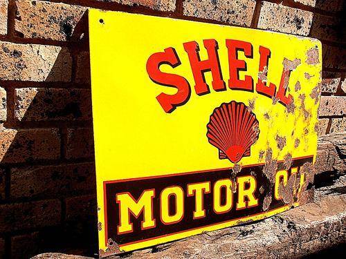 1930's SHELL MOTOR OIL enamel advertising sign. All advertising signs I have on offer are from the period, they are not the cheap reproductions that are floating around everywhere these days. These are the real McCoy! Most of them come from my grandfather's collection, they were one of his great passions.