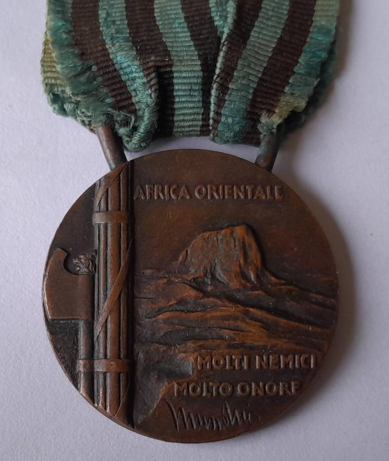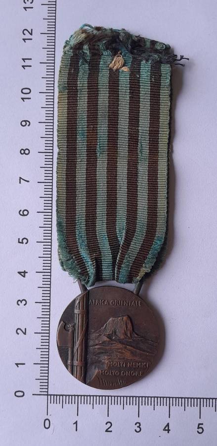 This medal was established by the Kingdom of Italy in 1936. It was awarded to Italian military personnel who participated in the Second Italo-Ethiopian War (1935-1936). The obverse of the medal depicts a half-bust of King Victor Emmanuel III. The reverse depicts an African landscape scene, along with an axe, and the inscription "AFRICA ORIENTALE" (East Africa) and "MOLTI NEMICI. MOLTO ONORE." (Many enemies. Much honor.).
