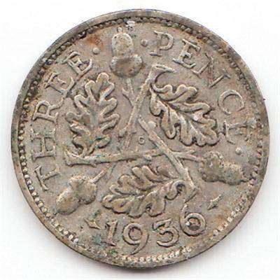 1936 GREAT BRITAIN 3 PENCE  GEORGE V, SILVER.500