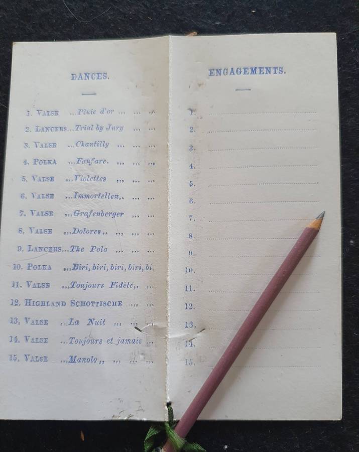 DESCRIPTION: DANCE CARD FOR LADYS TO BOOK DANCES WITH MEN AT THE BALL.
