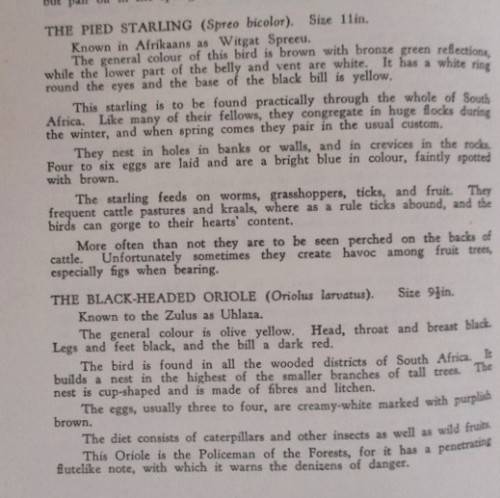 WRITTEN BY W.J. VORSTER IN COLLABORATION WITH CAPTAIN HUGH MACKAY AND PUBLISHED BY A FISHWICK AND CO, DURBAN IN 1938 - A RARE BOOK ON SOUTH AFRICAN BIRDS. COVER OF BOOK HAS BROWNED WITH AGE AND THE FLY LEAF HAS BEEN STUCK TO THE INSIDE COVER AND ALSO HAS A NAME AND ADDRESS WRITTEN IN PEN. OTHER THAN THAT A CLEAN, NEAT, TIGHTLY BOUND BOOK WITH 54 PAGES. REFER IMAGES