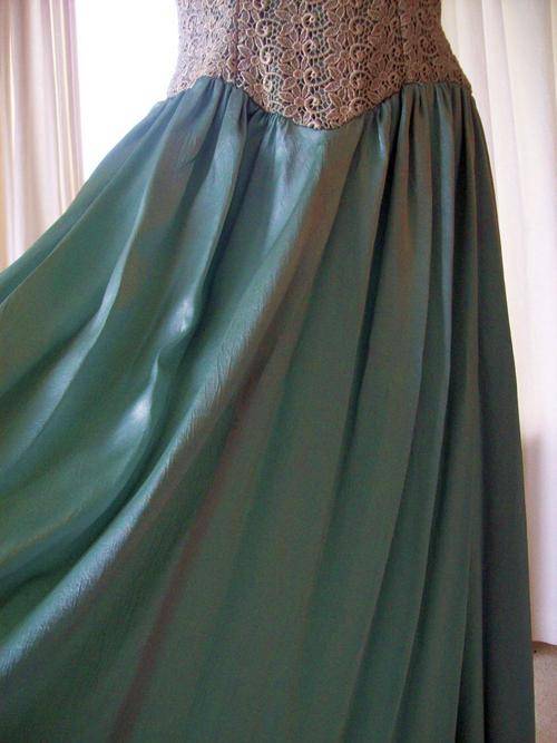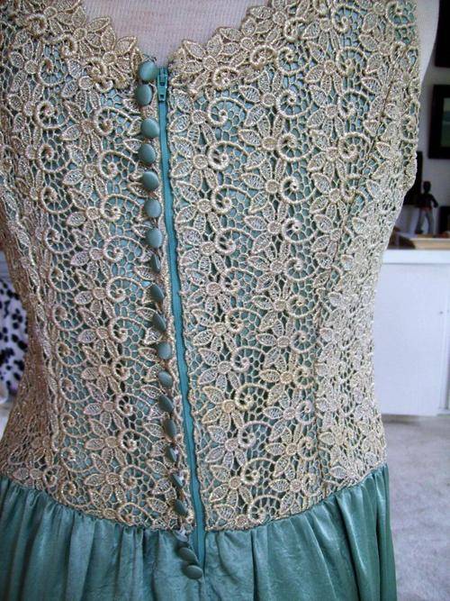 The sleeveless top is made from antique champagne/gold colored exquisite lace. The lace as well as the silk is in excellent condition.This is a dress that could be worn today on the red carpet. The cut, the style and the choice of materials are superb. All well taken care off dress. It can only be dry cleaned. And it makes you look slim.