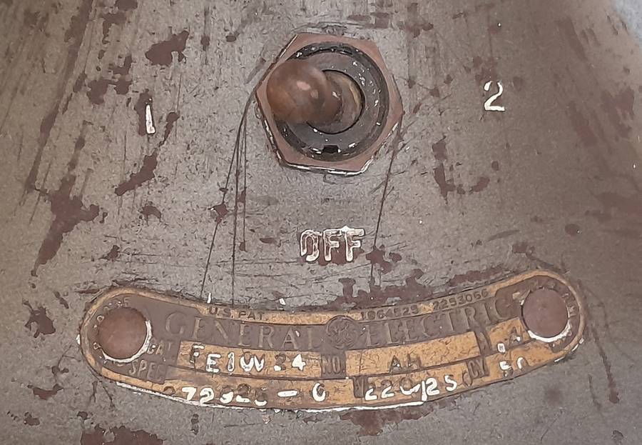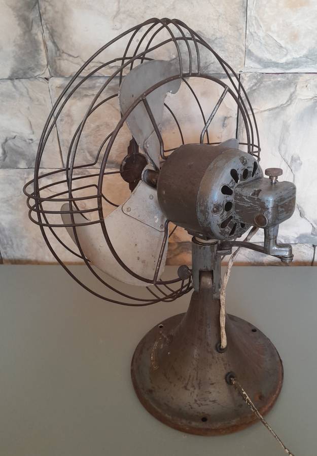 A late 1940's industrial all metal desktop fan by General Electric. This is the Vortalex model, so called due to it's unusual blade design. It has a heavy metal base and distinctly Art Deco design cage. It has 2 speed settings and comes with the original General Electric plaque to the front and metal serial number plaque to the side. The powerful motor runs well. Please note that it does not oscillate from side to side. Great collector's item or funky steampunk display piece.