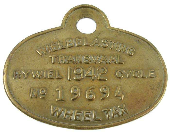 1942 BRASS TRANSVAAL WHEEL TAX BICYCLE LICENCE DISC