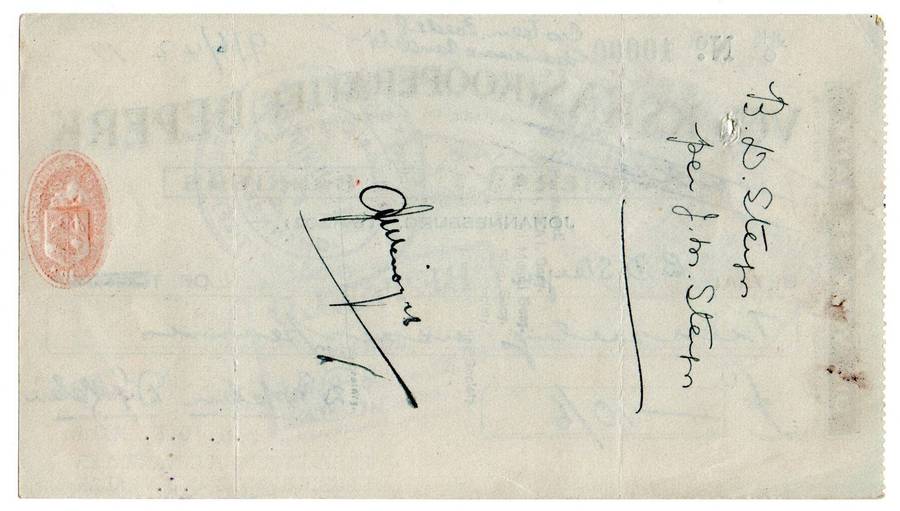 1942 Volkskas (Kooperatief) Beperk Cheque #10000, Johannesburg, 10 Shillings and 6 Pence from C. J. Malan Trust to B. D. Steyn, 1 Spike hole