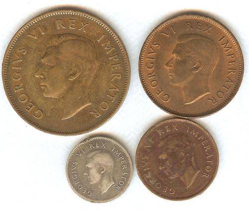 1943 SA UNION 1d PENNY, 1/2d HALF PENNY, 1/4d FARTHING AND 3d THREE PENCE