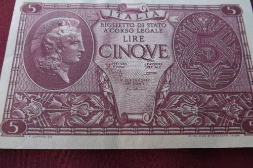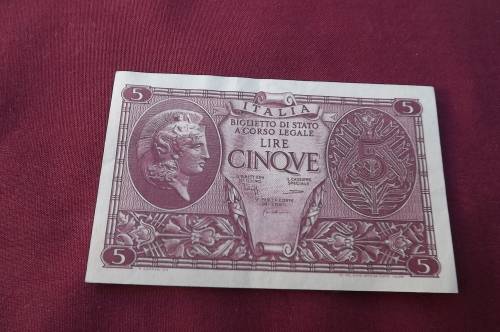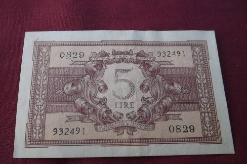 1944 Italy 5 Lire UNC banknote WW2 banknote.23 November 1944