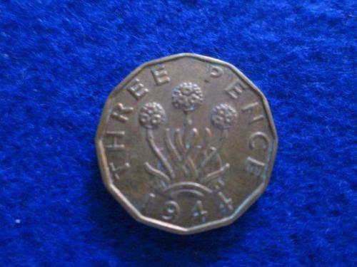 1944 UK 3 Pence. Circulated.