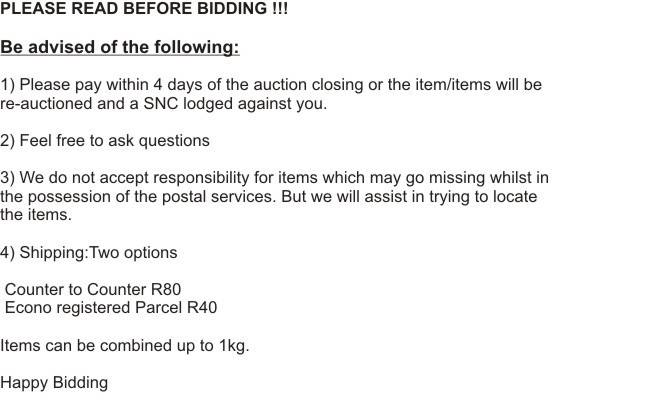 R35.00 Standard shipping using one of our trusted couriers applies to most areas in South Africa. Some areas may attract a R30.00 surcharge. This will be calculated at checkout if applicable.