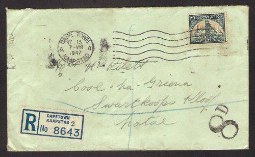 As Per Scans.1947 Union South Africa Cape Town to Natal Cover POSTAGE DUE 8d for sending Coins in a Posting Box.Unusually High Postage Due for a local postage cover.Seldom Offered