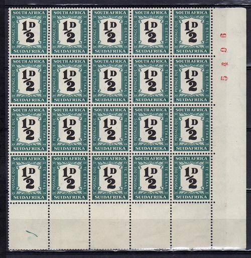 1948 Postage due ½d unhyphenated block of 20 with red sheetnumber MNH, with variety green line on margin. Superb!!