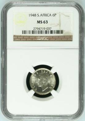 1948 UNION 6 PENCE - MS63 - NGC GRADE 4TH FINEST