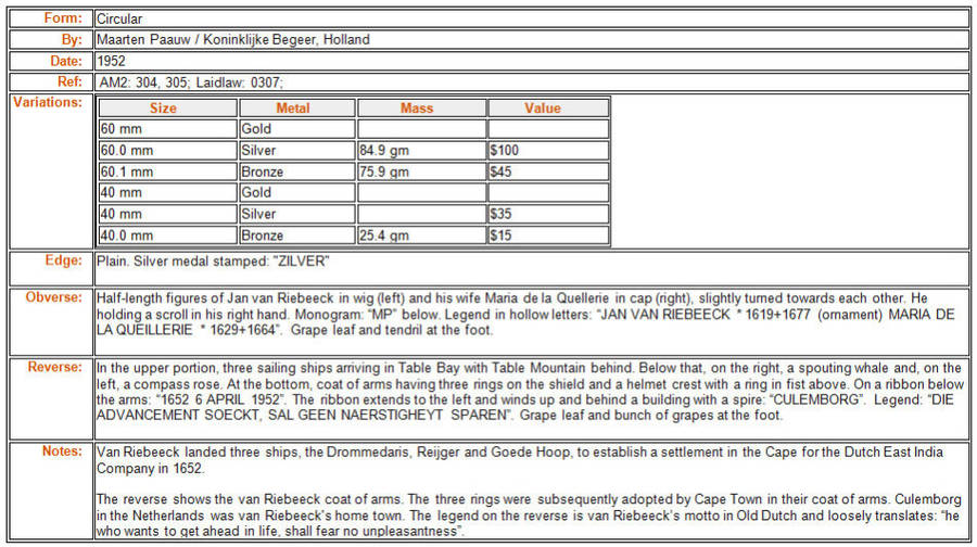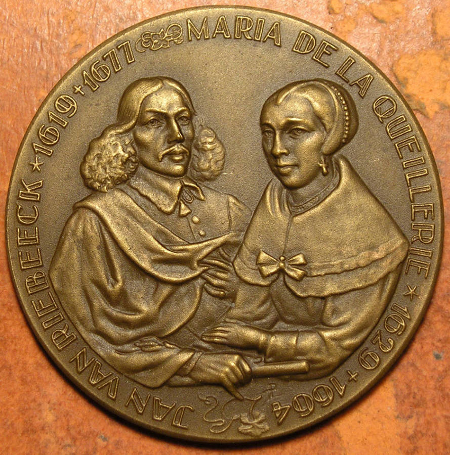 A Medal to Commemorate Jan van Riebeeck & his Wife Maria de la Quelleria and the Tercenteniary of the Arrival of his Three Ships in Table Bay in 1652.