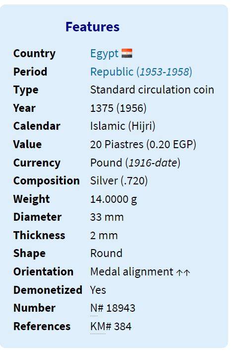 1956 | 20 Qirsh | Cairo, Egypt | Silver Coin