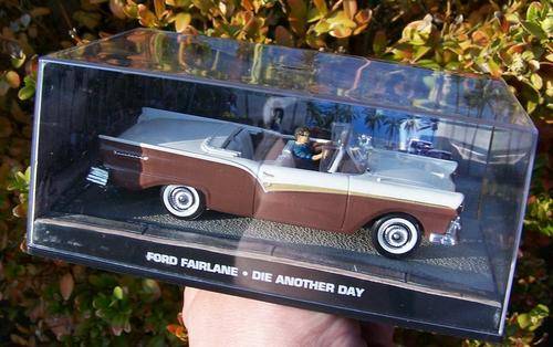 1957 Ford Fairlane Convertible. As seen in the 007 James Bond movie "Die Another Day". Model in display case. In the movie Die Another Day, James Bond (played by Pierce Brosnan) drives around Cuba in a 1957 Ford Fairlane convertible in a brown and cream color.