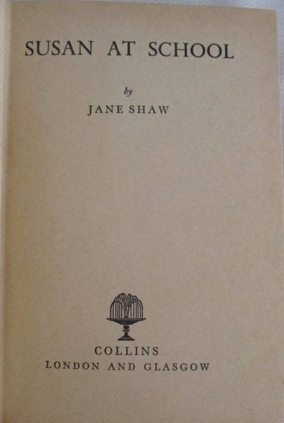 THE SUSAN SERIES WRITTEN BY JANE SHAW WAS PUBLISHED BY COLLINS BETWEEN 1952 AND 1969 AND THERE WERE 11 WRITTEN IN THE SERIES - THIS BEING THE 5TH ONE. PAGES HAVE YELLOWED/TANNED WITH AGE AND THERE IS A SMALL STAIN ON THE TOP OF MOST OF THE PAGES. OTHER THAN THAT A VERY CLEAN, NEAT, TIGHTLY BOUND BOOK - 19CM X 12.5CM WITH 189 PAGES REFER IMAGES