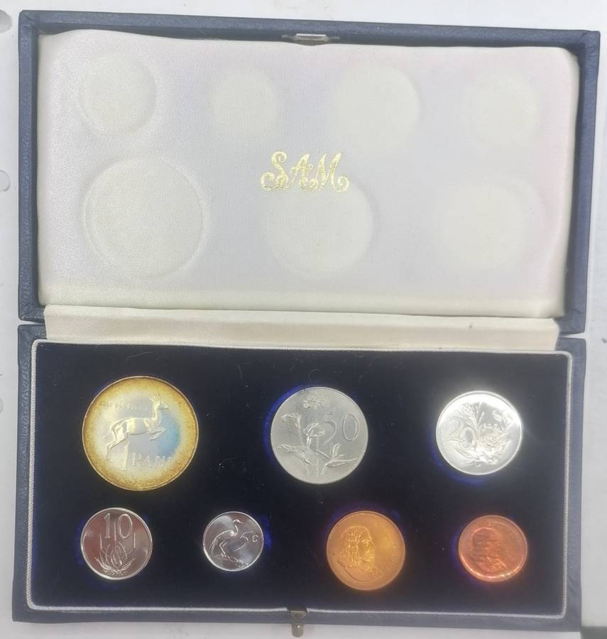 Superb near flawless set ,each coin GEM Proof or nearly so ,the silver Rand with gorgeous eye-appeal highlighted by a natural golden toning framing the reverse and springbok for enhanced effect.The nickels in typical blast-white with the 5 cents displaying some strong Cameo charecteristics. The coppers in flashy red with the 1 cent showing a hint of green iridescence and violet undertones.