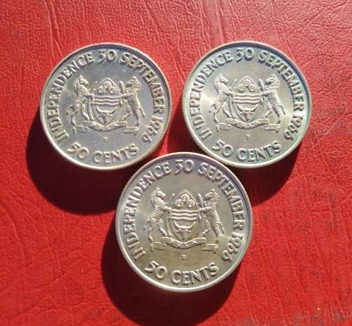 A silver (80%) Botswana 1966 50 cent coin. Weight: 10 grams each. Silver content: 80%. A non-circulating coin to commemorate independence. Low mintage of 40 000 only. Bid per coin to take all 3.