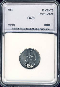 1966 E 10 Cent, Graded Proof 69, Ten Cent Coin, South Africa, English