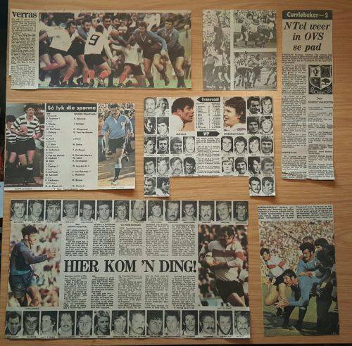Below : Newspaper articles and pictures of 1970's Currie Cup matches. Largest : bootom left : 300mm x 170mm. Smallest : second row from top : two small colour pics : 125mm x 75mm.