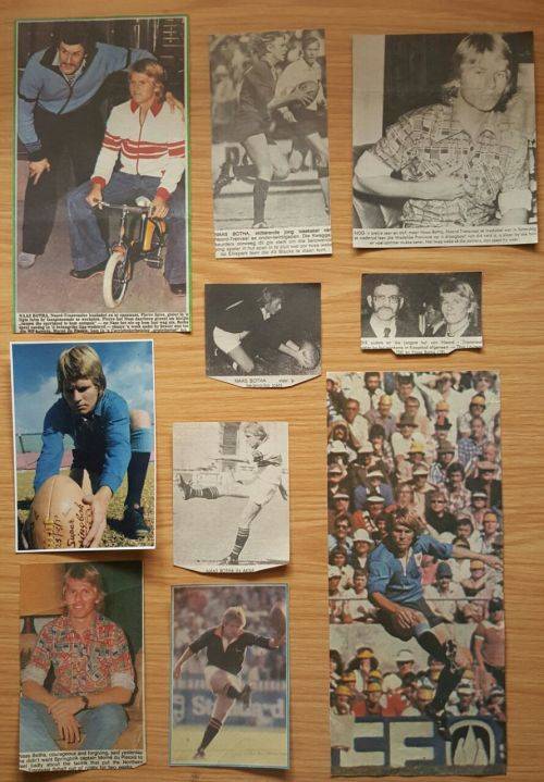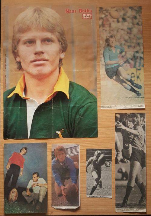 Below : Magazine and newspaper pictures of NAAS BOTHA, former Springbok rugby player and captain. Largest : top left : 390mm x 280mm (magazine centre fold). Smallest : bottom, 2nd from right : 140mm x 75mm.