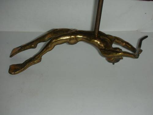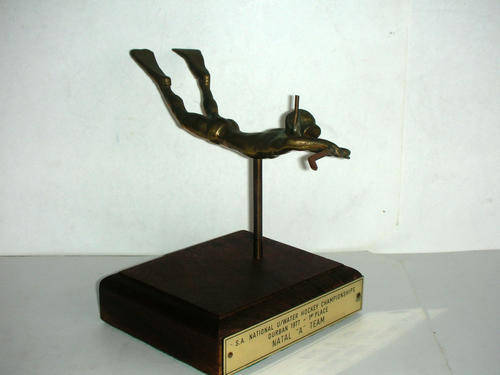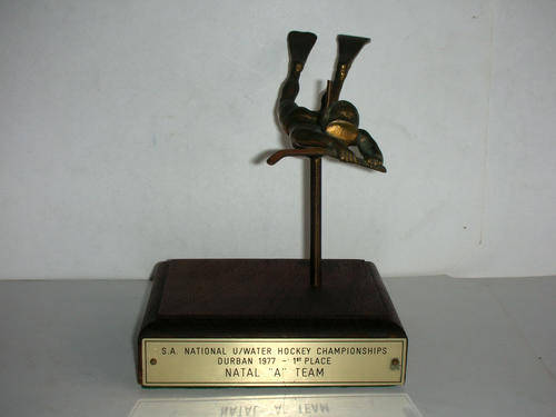 1970's bronze or brass Underwater Hockey figurine trophy, beautifully executed standing on a teak base, the plaque can be removed to use as a piece of art or desk ornament, 20 cms wide, 17 cms in height. Lettering on plaque: SA National U/Water Hockey Championships, Durban 1977 - 1st Place, Natal 'A' Team. Postage R60.00.