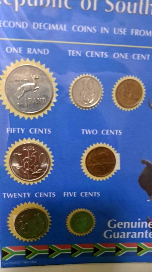 1 Rand ,50cent,20 cent,10 cent,5 cent,2 cent,1 cent Mounted on a printed sheet with double sided tape