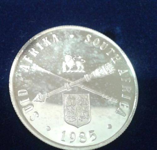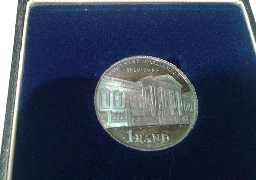 1985 SILVER PROOF R1 - PARLIAMENT. In SA Mint box. Normal blueish toning on coin that's not visible on camera images below.