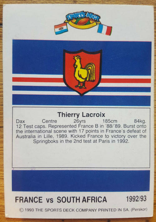 1992/93 Springboks vs France Trading Card - Thierry Lacroix (France)