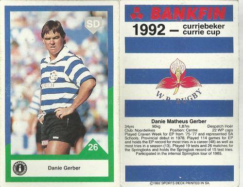 1992 Currie Cup Rugby Trading Card Danie Gerber