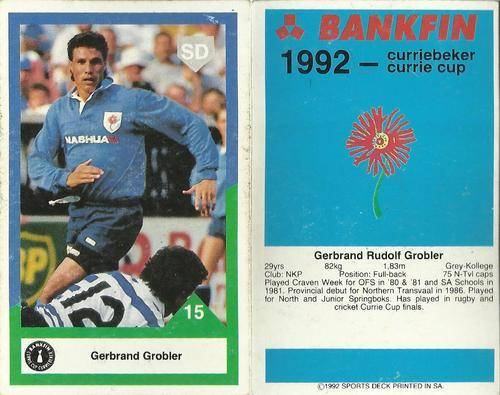 1992 Currie Cup Rugby Trading Card Gerbrand Grobler