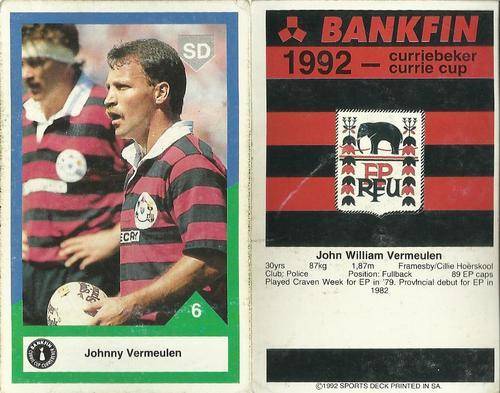 1992 Currie Cup Rugby Trading Card Johnny Vermeulen