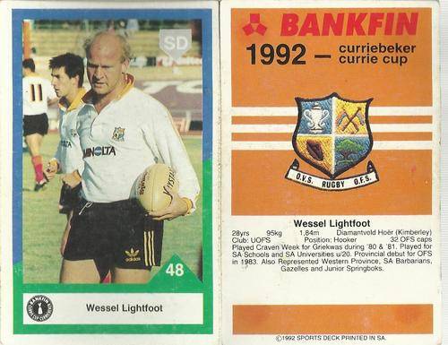 1992 Currie Cup Rugby Trading Card Wessel Lightfoot
