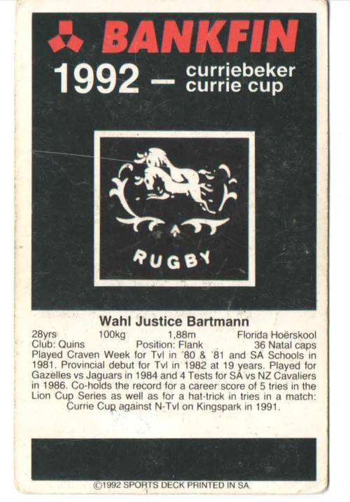 1992 Sports Deck Rugby Card Wahl Bartman Autograph Signed Currie Cup