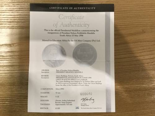 1994 Mandela FNB 5oz silver Inauguration medallion