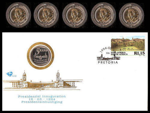 1994 Nelson Mandela Inauguration FDC 6.3c with ORIGINAL UNCIRCULTED R5-00 Coin + FIVE 2008 90th Birthday Uncirculated R5-00 coins (in capsules).