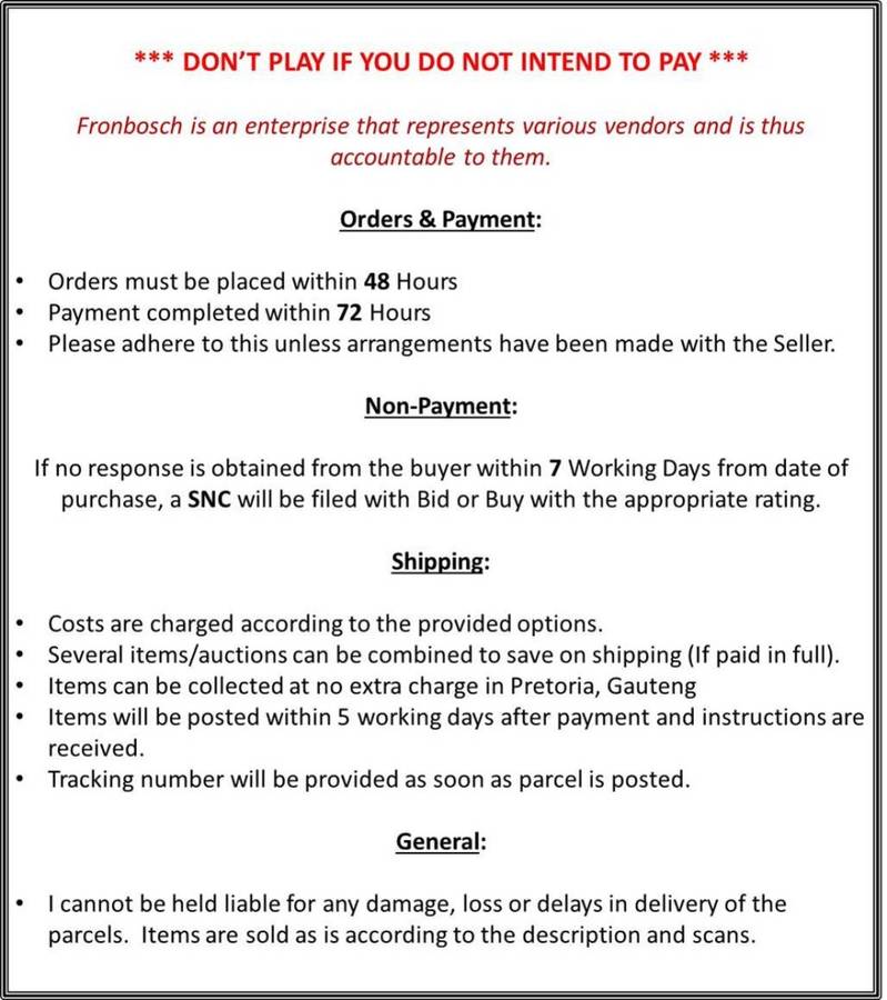 R35.00 Standard shipping using one of our trusted couriers applies to most areas in South Africa. Some areas may attract a R30.00 surcharge. This will be calculated at checkout if applicable.