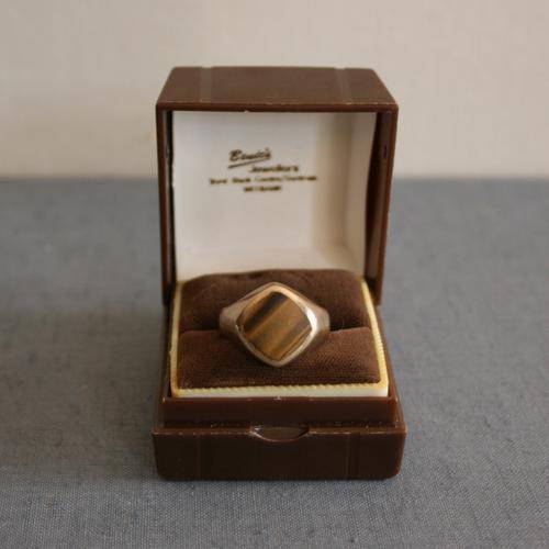 This vintage ring features a tiger's eye inlaid in 9ct gold and comes in it's original box. The ring opening measures 19mm in diameter and weighs 6g on a kitchen scale. The ring is inscribed with the maker's mark and stamped 9ct.