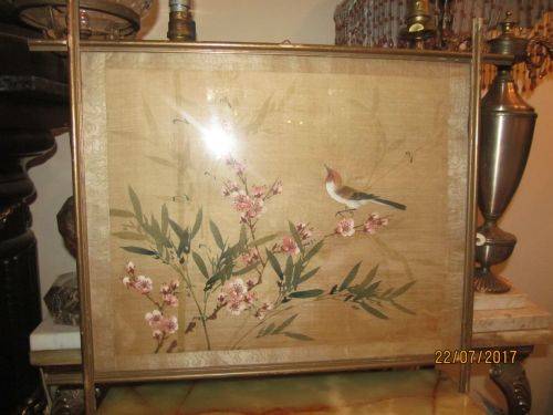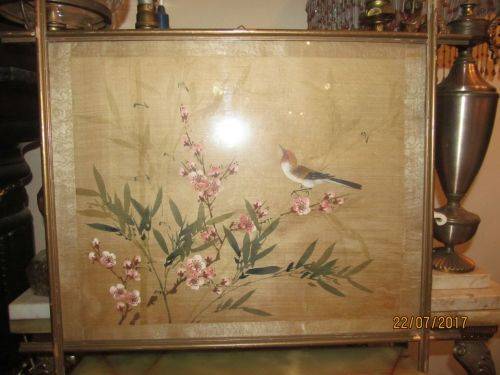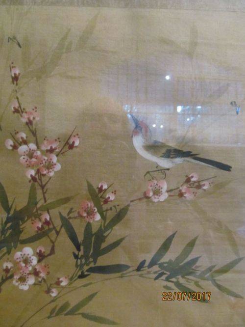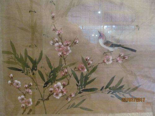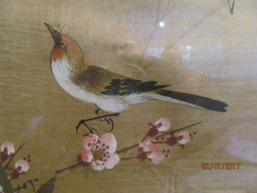 THIS RARE DECORATIVE PIECE DEPICTS AN INQUISITIVE BIRD PERCHED UPON A SHADED BRANCH PAINTED IN A COLOR SLIGHTLY DARKER THAN THE GENUINE SILK UPON WHICH IT IS PAINTED. THIS TECHNIQUE CREATES THE WONDERFUL ILLUSION THAT THE BRANCHES ARE SHADED AND IN THE BACKGROUND. IN THE FOREGROUND ARE BEAUTIFUL PINK AND WHITE FLOWERS BLOOMING ABUNDANTLY FROM BRANCHES
