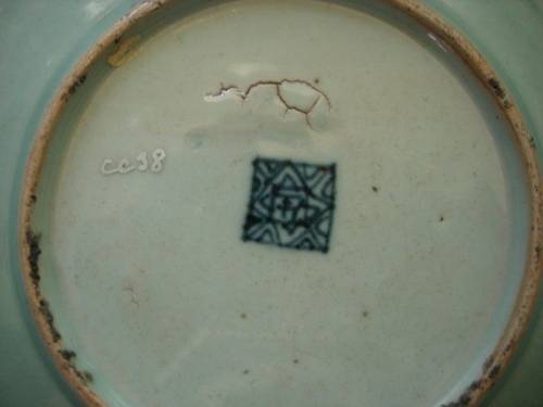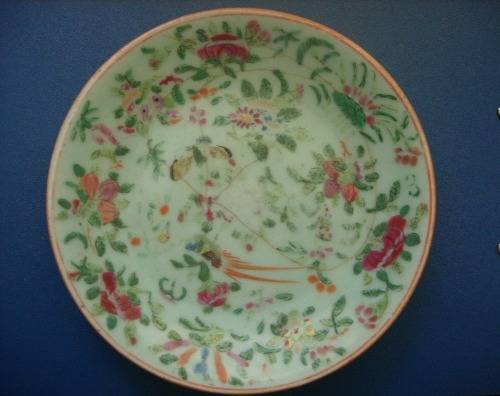 This Chinese porcelain plate is circa 1850. It is celadon famille rose with a blue seal on the reverse. The decoration is worn and has surface hairline cracks, there is a firing mark on the reverse. Measuring 18cm (7 inches) diameter. There are no chips.