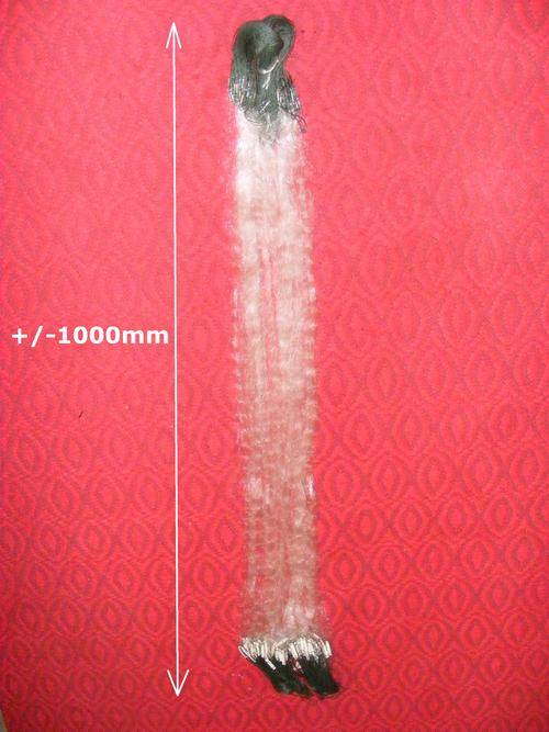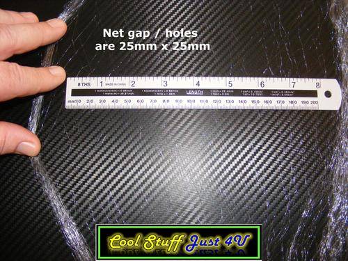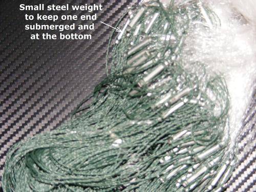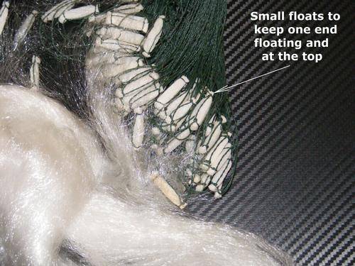 This nylon net is 1 meter in height & 30 meters in length fitted with numerous small steel weights at the bottom end to keep the bottom portion down &/or on the bottom as well as numerous floatation devices to keep the top at or near the surface, thereby ensuring that the net is up & down (upright) in quiet water. The gaps / holes in the net are approximately 25mm x 25mm & made of very fine but strong nylon.