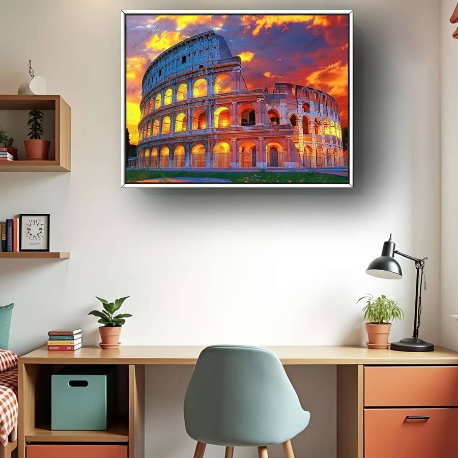 This stunning puzzle captures the essence of the Colosseum, a famous landmark in Rome, Italy. As the sun sets, the ancient arena is illuminated by soft, warm lights, casting an orange-red hue against the backdrop of a blue sky. The clouds in the sky range from pristine white to deep blue, adding a sense of grandeur and mystery to the scene.