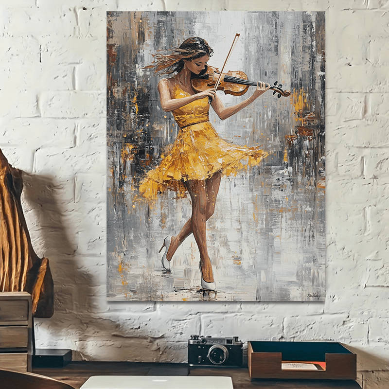 1pc  Dynamic Violin Playing Lady Canvas Art Energetic Performance in Yellow Dress a Beaut
