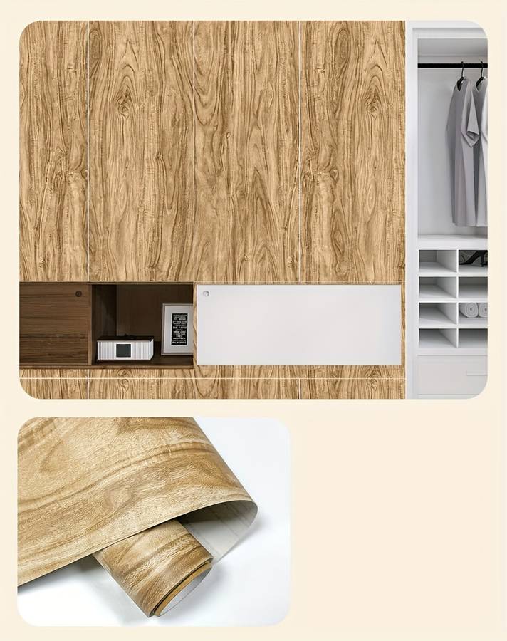 1PC Wall StickersWood Color60cmX1000cm 23.62inX393.7in It is normal for there to be slight errors in the size due to manual cutting, and it is normal for there to be color differences due to different shooting angles. Please do not take pictures if you mind. Material:Polyvinyl chloride
