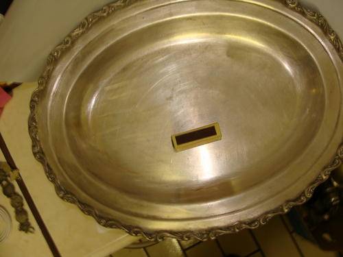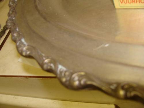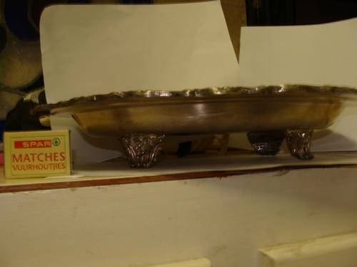 1SILVER PLATED TRAY WITH 4 FEET- DEEP CHUNKY ORNATELY RAISE DECORATED OUTER EDGE -