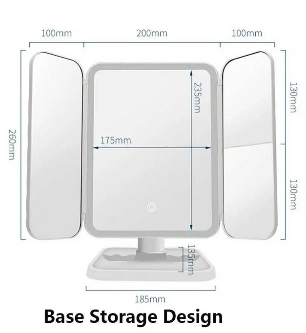 This makeup mirror features 52 LEDs that deliver bright and eye-friendly lights in warm, cool, or natural color mode. The trifold design and 1X/2X/3X magnifying mirrors let you see all your face clearly so as to apply exquisite & precise makeup. The humanized design, such as the storage panel, 90° swivel, and leather-like texture, adds convenience and decoration for your usage.