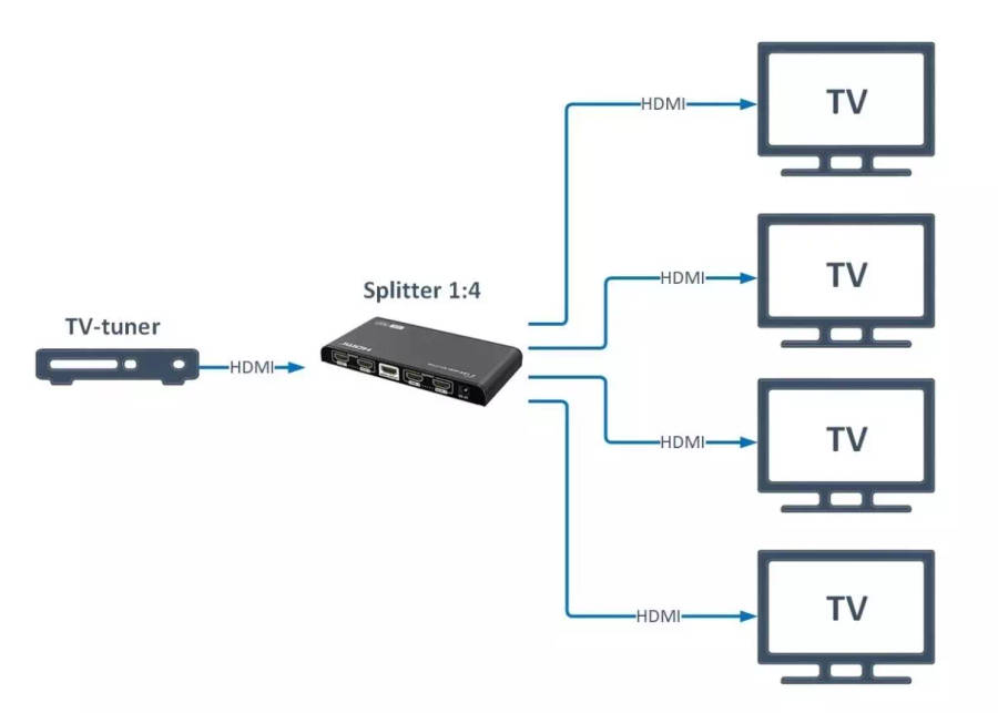 The UltraHD 1×4 HDMI Splitter uses a single HDMI source that splits to multiple HDMI displays/screens. The Splitter allows one HDMI devices to be split into four HDMI compatible monitors / HDTV's or projectors. The Splitter can also be placed at the end of a long HDMI cable to regenerate the HDMI signal.